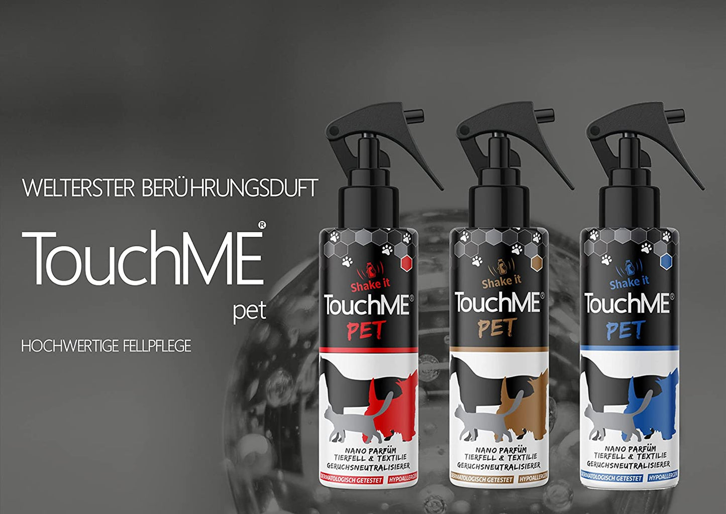 Il nostro profumo "blue" è il proverbio "freschezza". La combinazione di fragranze naturali selezionate entusiasma con la sua semplicità. Per l'uso su e intorno agli animali. Su pelliccia/pelo, cestino, albero tiragraffi, sulla coperta per cavalli in auto o anche sul divano. Pelliccia morbida come la seta grazie alla nostra toelettatura integrata TouchMe. TouchME pet combatte gli odori e produce con l'applicazione interattiva una sensazione di freschezza TouchME rende la prima volta possibile creare profumi interattivi. Le piccole nanocristalli servono per la conservazione dei principi attivi corrispondenti e conservarli sotto la chiusura fino a 2 anni. Ad ogni contatto con la superficie trattata, le sfere nano rilasciano il loro interno e garantiscono un tocco in ogni situazione. Il modello "Nano" è sinonimo di una denominazione delle dimensioni di un oggetto. Un nanometro corrisponde a un miliardo di metri (10-9 m). La nanotecnologia è attualmente un oggetto di applicazioni mediche. Utilizziamo quotidianamente sotto forma di articoli cosmetici e industriali, ma non è come TouchME. Le nanocristalli come succhi profumati conferiscono al TouchME una caratteristica unica di regolazione. Gli odori di animali sono perfetti per l'uso su e intorno all'animale. Su pelliccia/pelo, cestino, albero tiragraffi, sulla coperta per cavalli in auto o anche sul divano. Cani bagnati o forte profumo di gatti? TouchME pet neutralizza gli odori degli animali domestici con capsule nanocristalli uniche senza residui di spruzzo. Spruzzare TouchME Pet direttamente sul pelo di Sammy, Bella, Hansi & Co. o trattare altre superfici. Gli ingredienti di TouchME Pet sono assolutamente innocui per gli animali domestici e altri abitanti. Lo spray è ipoallergenico, dermatologicamente testato e adattato al valore del pH del vostro amato. La cura del pelo garantisce un tocco morbido e morbido.